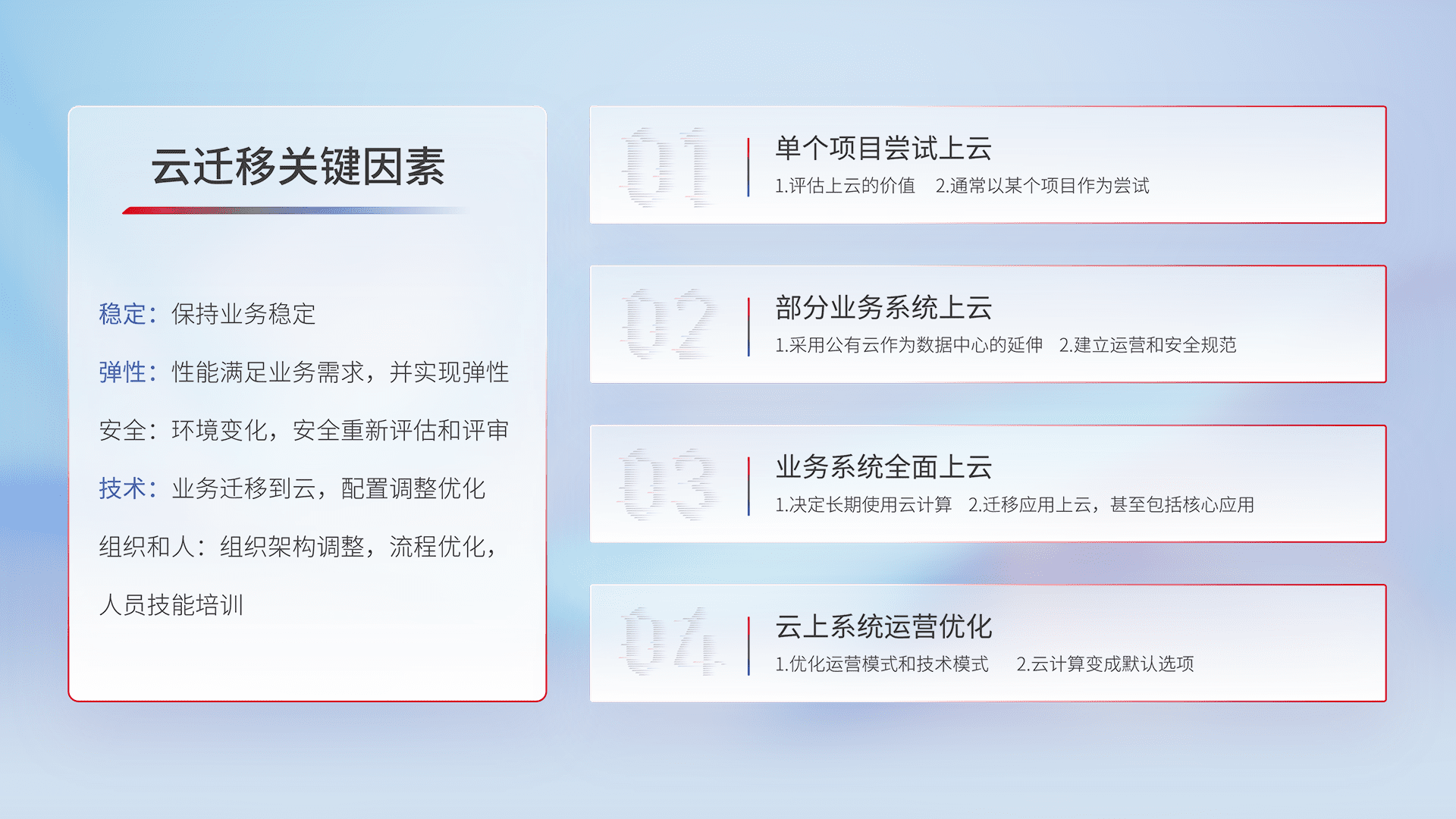 结合实际业务,,,,从规划设计、、、云平台选型、、、、云原生改造、、、数据迁移、、、、集成交付,,,迁移全过程为客户识别最佳上云路径,,,做好风险识别管理,,,,设计网络架构、、身份权限、、、安全审计合规、、、操作审计、、日志审计、、、、监控告警策略、、、、多站点容灾设计等,,,,对云上基础设施进行整体规划,,提升IT治理水平,,,以满足弹性、、、高可用、、、高性能的需求。。