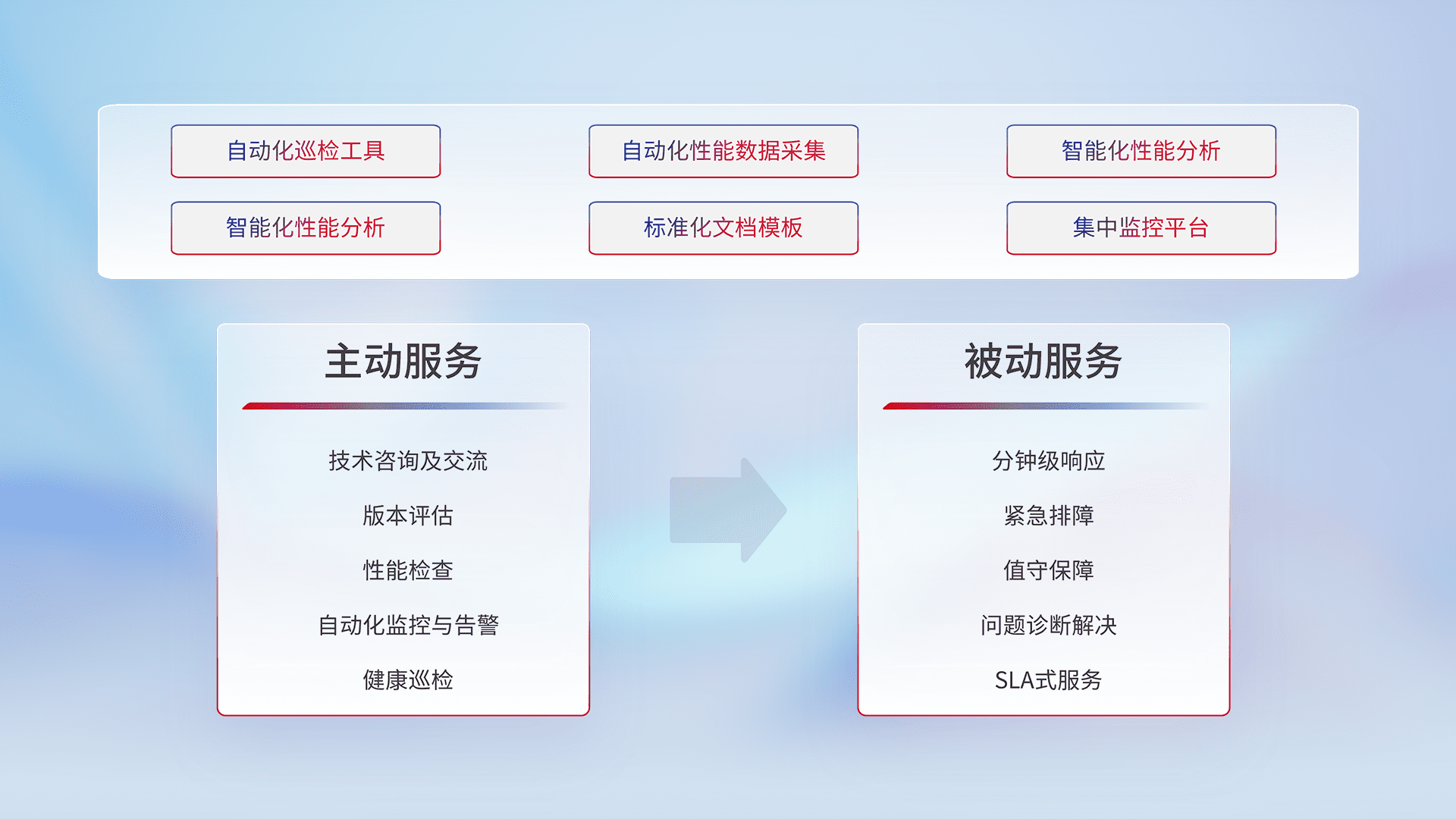 智能化工具和标准化文档,,,保障服务质量,,提供主动服务(包含技术咨询、、、、版本评估、、性能检查、、、自动化监控与告警、、健康巡检)和被动服务包含(分钟级响应、、、紧急排障、、、、值守保障、、问题诊断解决、、、、SLA服务)。。。。