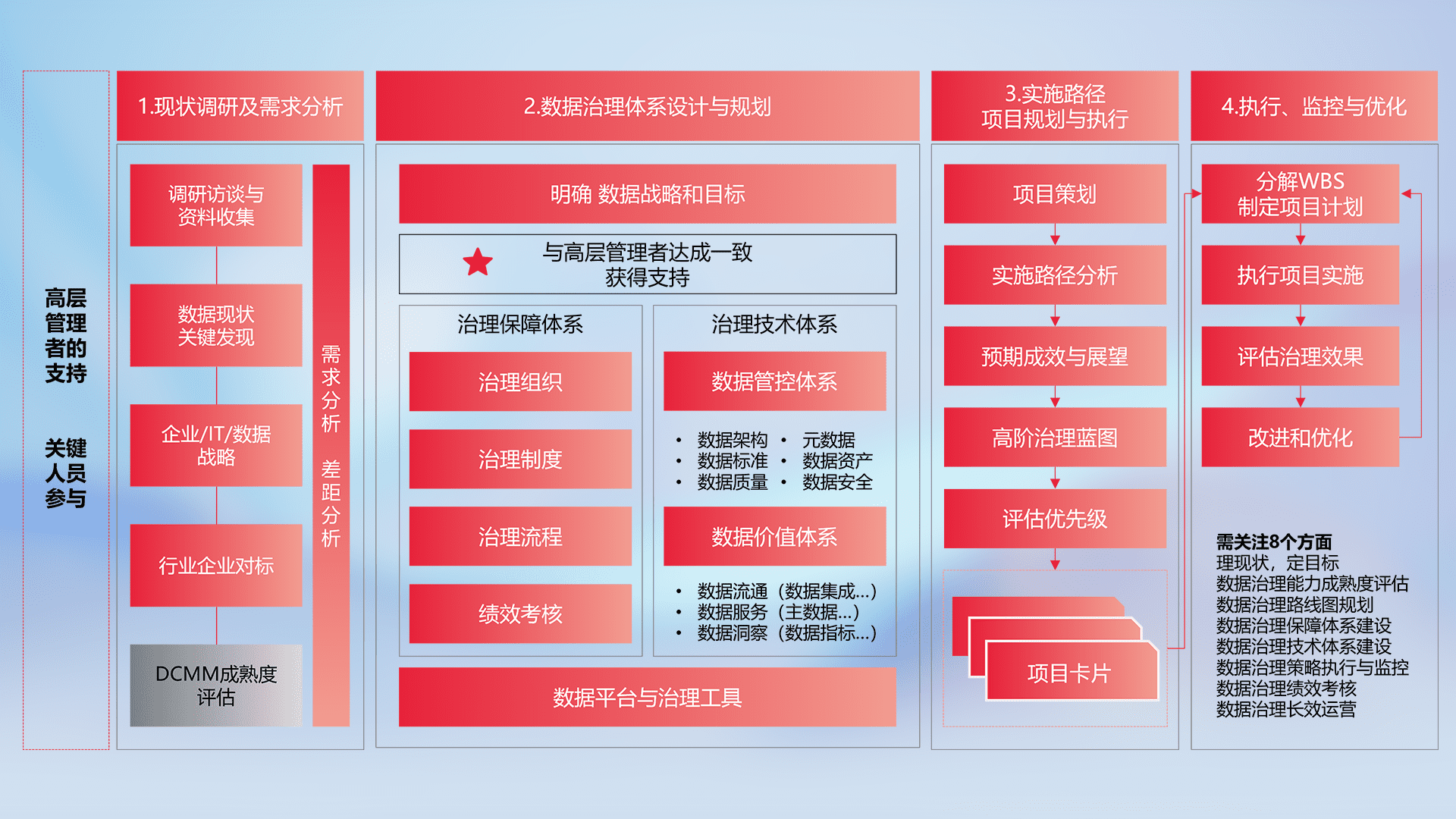 制定并执行统一的数据标准,,,,规范数据定义和格式,,,消除冗余和不一致性,,,实现跨部门和跨系统的数据一致性,,为企业提供标准化的数据基础。。